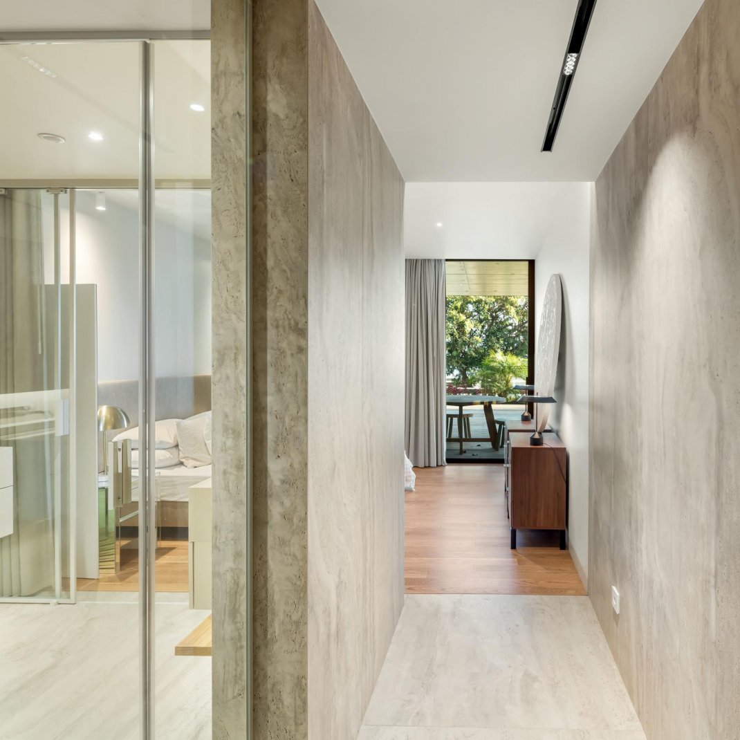 In the Savoy Residence | Monumentalis, all details were thought out and the choice of materials privileged the high quality and the connection to nature with emphasis on the use of the elements exposed concrete, stone, glass and water.